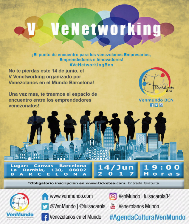 Desde Venmnundo en Barcelona (VenMundoBCN) queremos invitarte a la V EDICIÓN DEL VENETWORKING, el punto de encuentro para los Empresarios, Emprendedores e Innovadores Venezolanos en Barcelona, a realizarse mañana miércoles 14 de Junio de 2017 en Canvas Barcelona (La Rambla 130,...