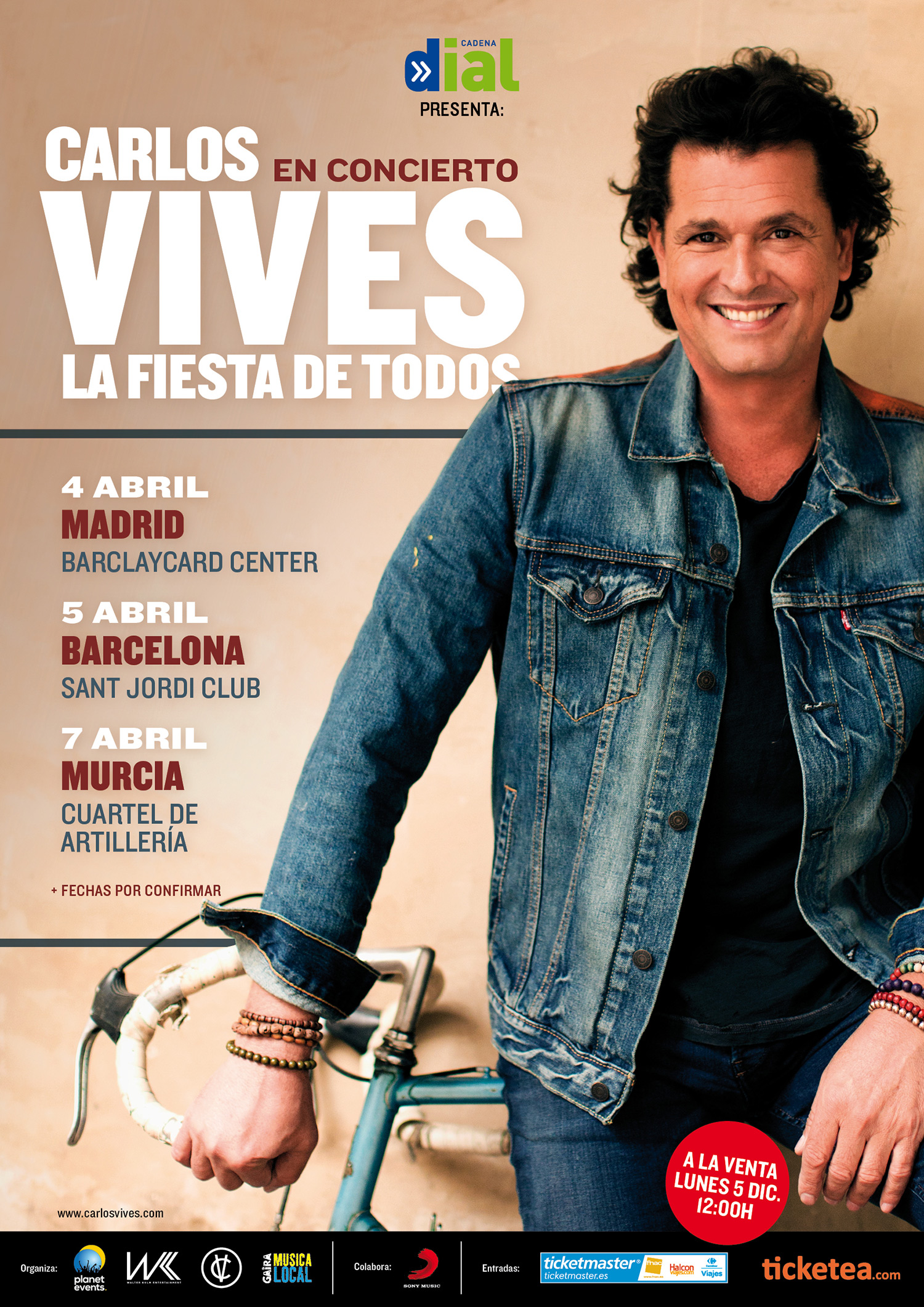 (Nota de prensa 02.12.16)-. Carlos Vives ha anunciado que actuará el próximo año en España presentando su gira “La fiesta de todos”, con Cadena Dial como emisora oficial. Los conciertos tendrán lugar el 31 de marzo en Bilbao (recinto por confirmar), el...
